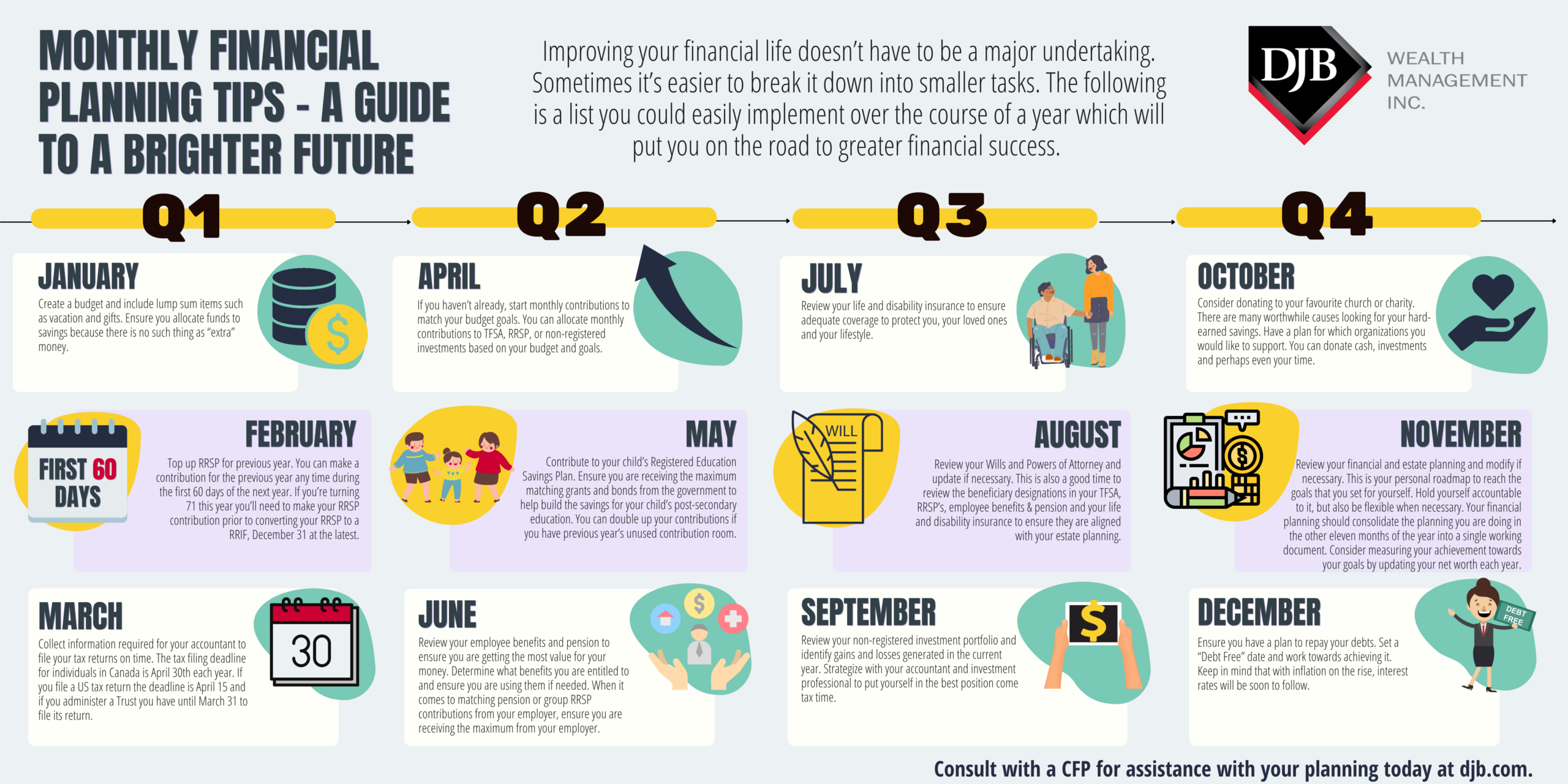 Review your Wills and Powers of Attorney and update if necessary. This is also a good time to review the beneficiary designations in your TFSA, RRSP’s, employee benefits & pension and your life and disability insurance to ensure they are aligned with your estate planning.